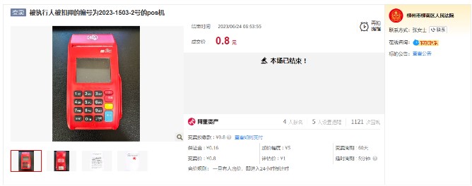 以今年6月柳州市柳南区人民法院的一次拍卖为例,一台被执行人被扣押的POS机以仅0.8元的价格成交。