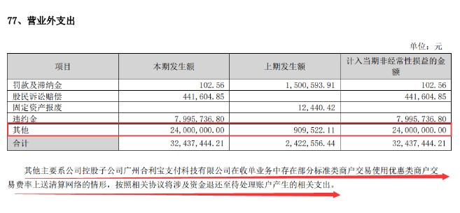 根据最新的中期报告,仁东控股已经披露了需要退还的金额,总计2400万交易手续费。报告还显示,营业外支出中的一大部分是由于广州合利宝支付科技有限公司在收单业务中存在上送清算网络的问题所导致的。根据相关协议,涉及资金已经退还至待处理账户,进一步减少了公司的营业外支出。